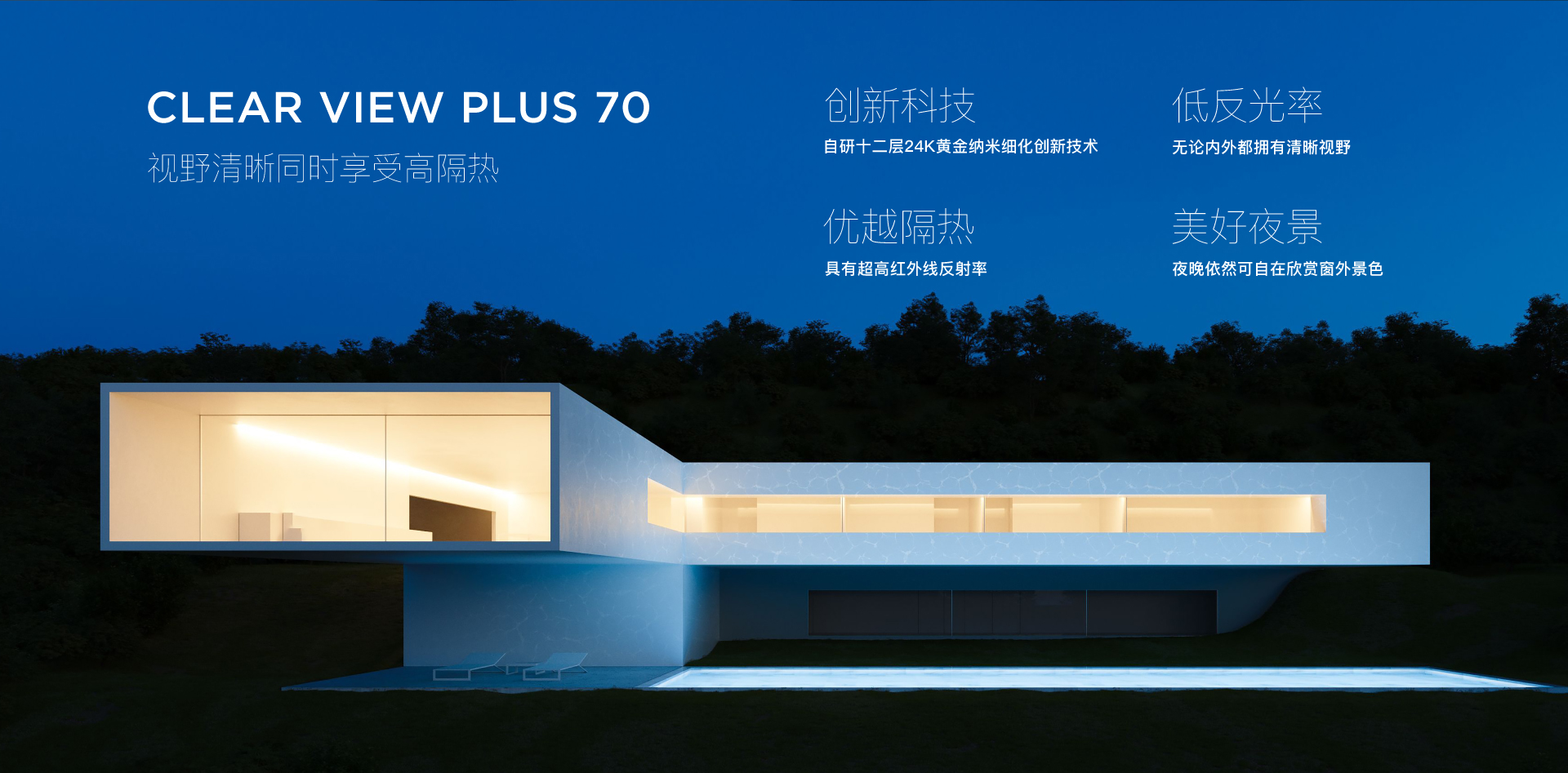 CLEAR VIEW PLUS 70自研十二层24K黄金纳米细化创新技术,以强大的红外线反射性能取代吸收热量的隔热方式,提供领先业界的红外线反射率,达到超群卓越的隔热性能。