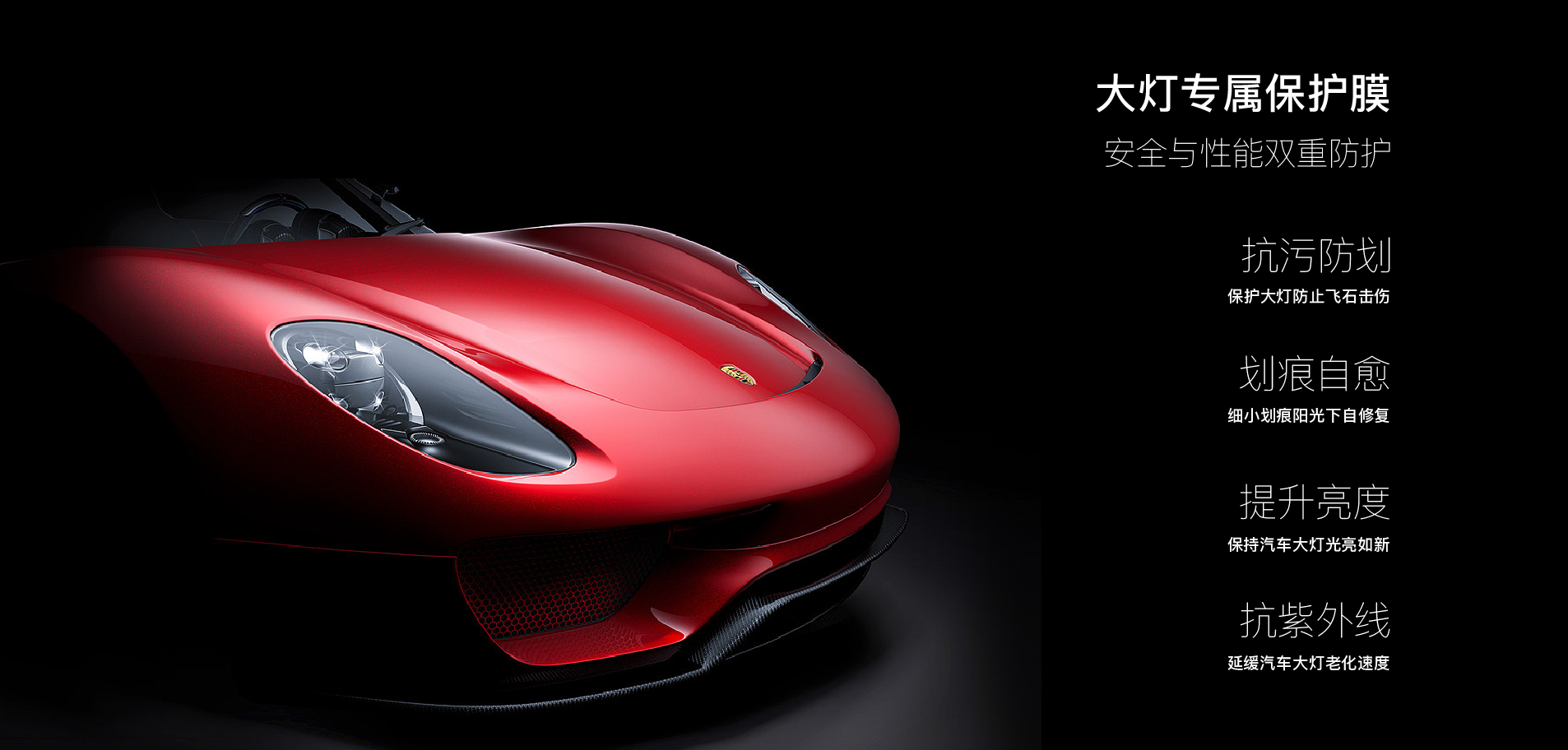 保护膜表面的轻微划痕以及洗车产生的太阳纹,通过太阳暴晒或冲淋热水,就能够驱动划痕自体修复功能,恢复原本光滑的表面,让汽车大灯光亮如新。