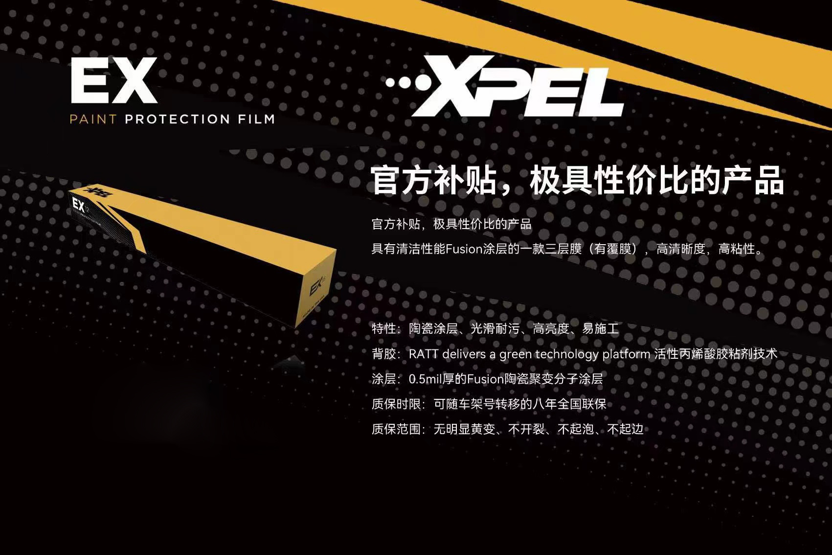 守护地球我们义不容辞,新能源车发展已成为不可撼动的趋势,XPEL 为新能源车打造的漆面保护膜产品,集科技和性价比于一身的 EX 系列,震撼来袭。Fusion 陶瓷聚变分子涂层EX 漆面保护膜自带疏水特性,表面更加光滑耐污,风雨中依然夺目。划痕自愈先进的 EX 漆面保护膜,细小划痕和漩涡痕迹,通过太阳暴晒后可自我修复。亮度提升EX 漆面保护膜具有高清晰度,贴后可提升车漆亮度,爱车色彩更加艳丽,光彩夺目。更多 EX 产品信息,可登录 XPEL 中国官网-产品展示查看。